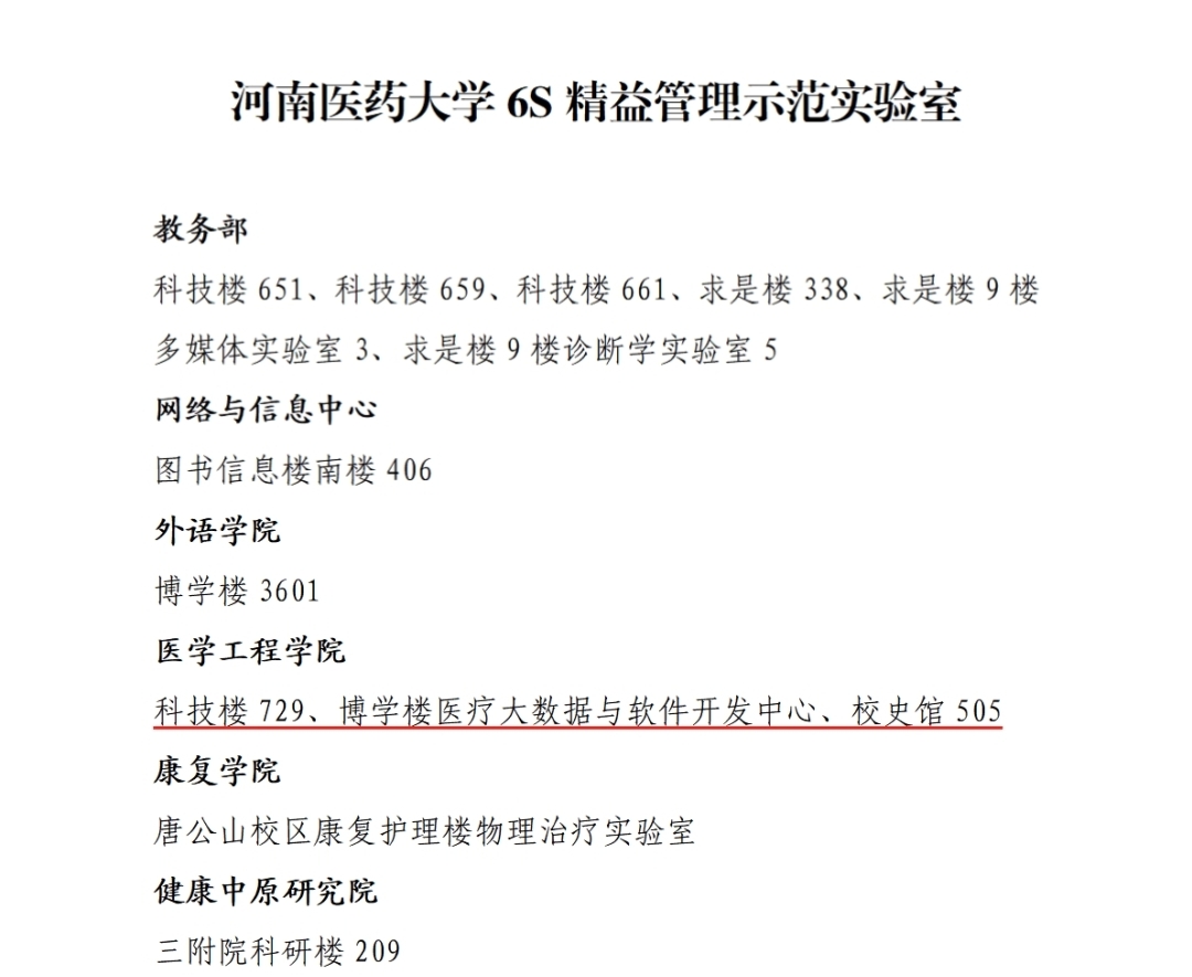 此次评选中,学院科技楼709、科技楼723办公室获评“6S精益管理示范办公室”,办公环境整洁规范、流程高效有序,成为管理标杆;科技楼729、博学楼医疗大数据与软件开发中心、校史馆505获评“6S精益管理示范实验室”,以标准化管理筑牢科研教学安全防线;学园一公寓1120、学园一公寓1129、学园六公寓6604、学园六公寓6619宿舍获评“6S精益管理示范宿舍”,展现了学子良好的生活素养与集体凝聚力;我院党委委员柴汝闯、党政办主任常金龙获评“6S精益管理先进个人”,以责任担当推动管理工作落地见效。