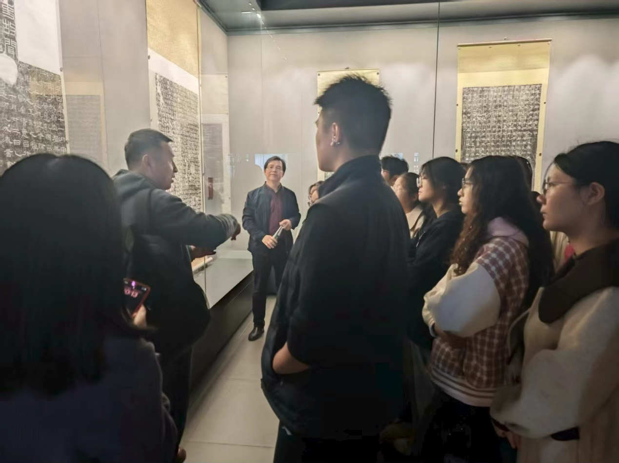教研室老师结合具体展品,为同学们深入剖析不同汉碑的书法特点、历史背景以及拓片制作技艺,将课堂上的理论知识与眼前的艺术实物紧密结合,使同学们对隶书的笔法、结体和章法有了更为直观和深刻的理解。
