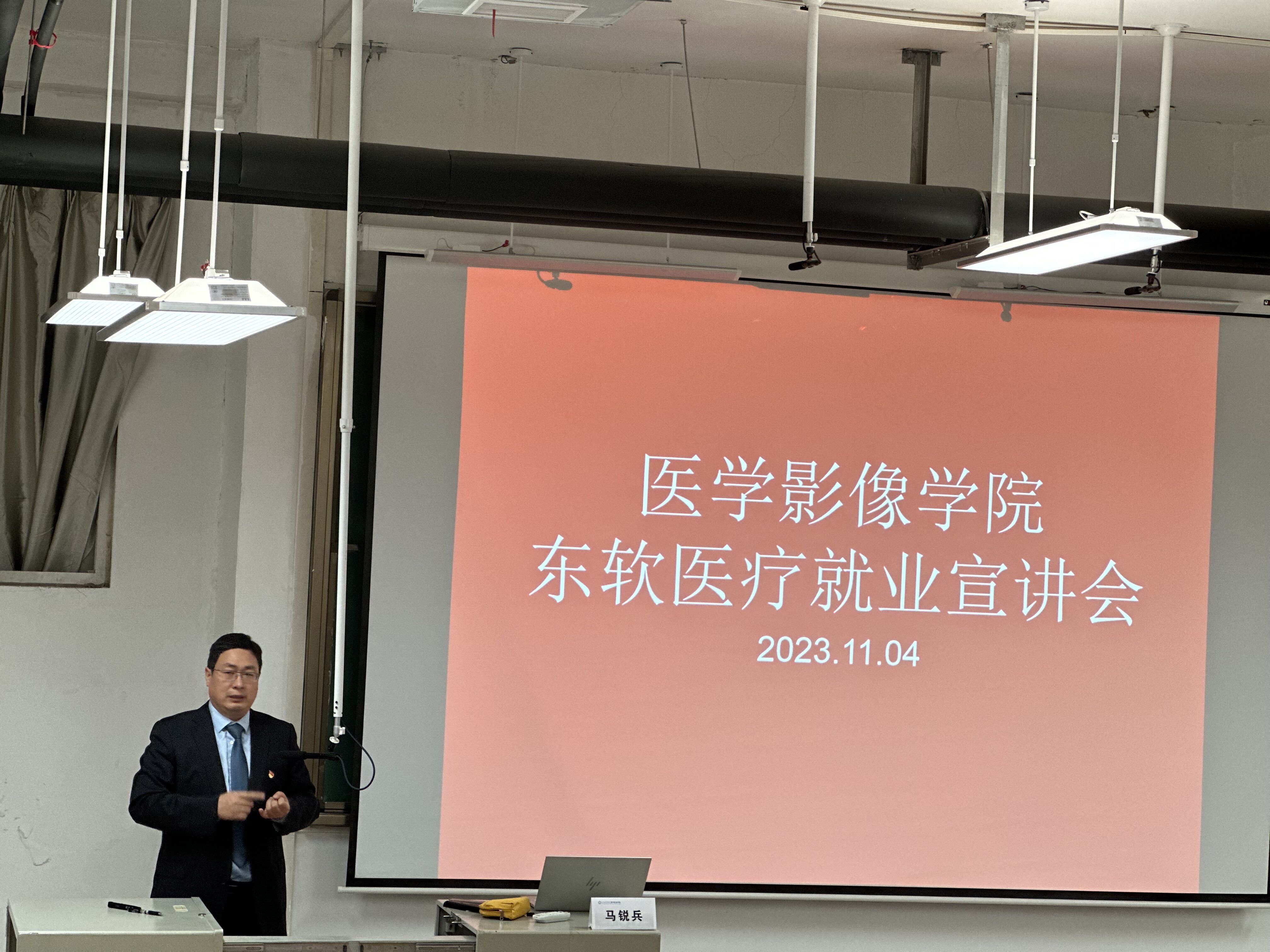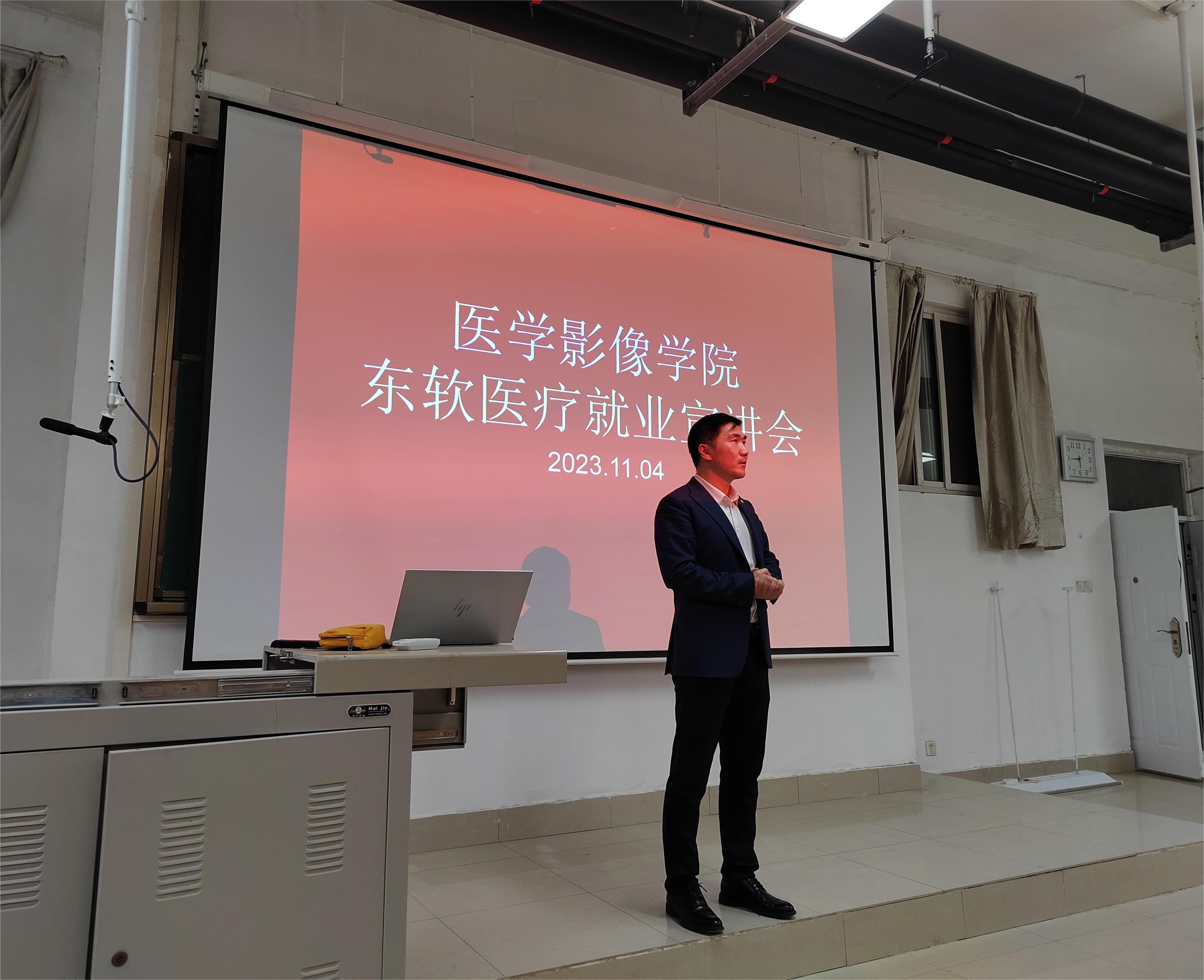 为拓展学生就业渠道,提供学生了解业内龙头企业的机会,11月4日,我院在卫辉校区教学楼1204教室举办东软医疗就业宣讲会。东软医疗智慧影像软件研发中心总监马锐兵主讲。院党总支书记、院长赵俊强,副院长韩东明,东软医疗科研临床研究院院长梁晓云,第一附属医院医学影像学部主任、放射科主任梁长华,核磁共振科主任闫瑞芳,东软医疗Mdass解决方案负责人黄健出席宣讲会。卫辉校区医学影像学专业全体学生参加。